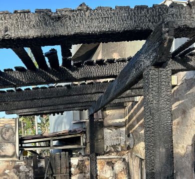 בעירה בפרגולות של שני מבנים סמוכים, כאשר עשן כבד חודר אל תוך בתי